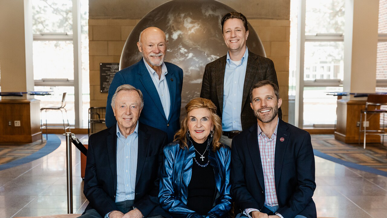 Photo by: Nicole Wickens – Green Door Photography. Pictured are (front row, left to right) Mike Halligan, retired Dennis and Phyllis Washington Foundation executive director; Phyllis J. Washington; UM President Seth Bodnar; (back row, left to right) Dr. Dan Lee, dean of the Phyllis J. Washington College of Education; and Jon Bennion, Dennis and Phyllis Washington Foundation executive director.